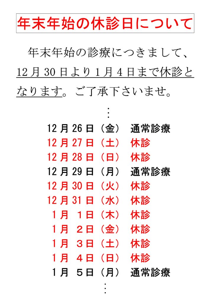 年末年始の診療は、令和7年12月30日(火)から令和8年1月4日(日)まで休診となります。ご了承下さい。